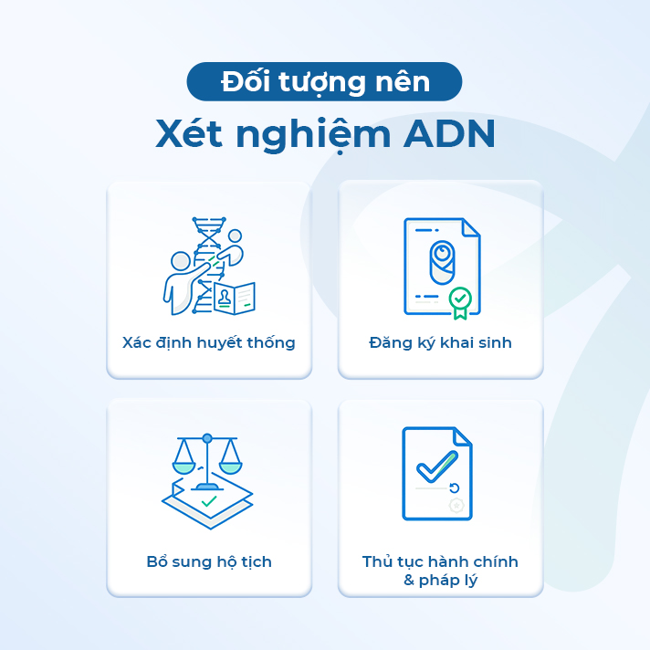 Đây là cách kiểm tra chính xác nhất hiện nay khẳng định các mối quan hệ huyết thống: Cha - Con, Mẹ - Con hoặc quan hệ huyết thống trong dòng họ. - Đối với mục đích hành chính: Các giám định ADN pháp lý được dùng để hoàn thiện hồ sơ như khai sinh, nhập tịch, visa định cư hoặc các thủ tục tại tòa án